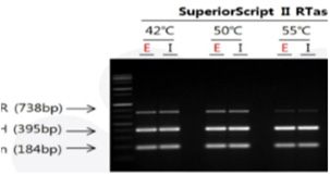 | Thermostability of SuperiorScript II on 3 targets. cDNA was synthesized from 500 ng total HeLa RNA for beta-actin 184bp, GAPDH 395 bp and TFR 738 bp. One-tenth of the cDNA reaction was used for 30 cycles of PCR with nTaq-multi HOT |